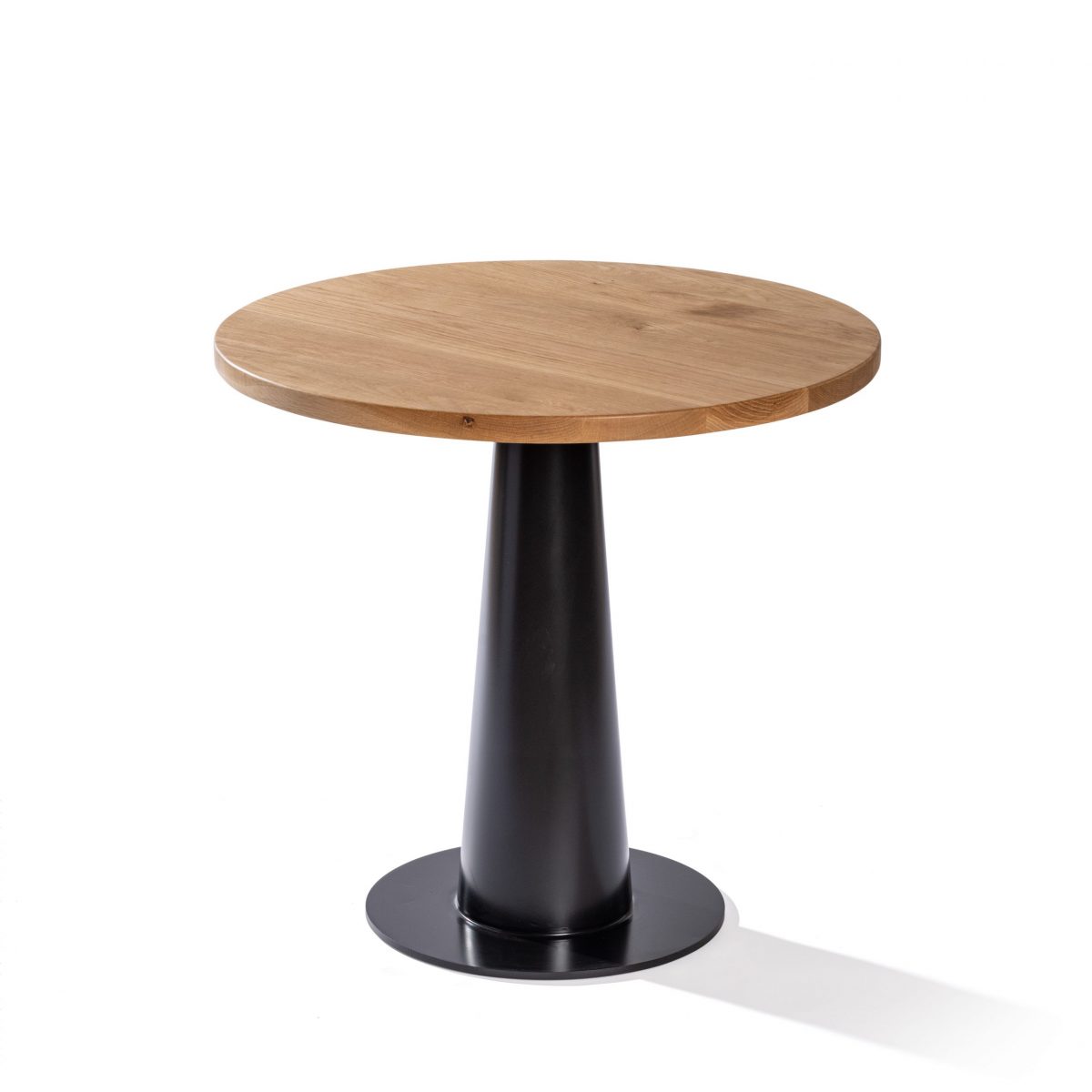 La fotografía muestra la Mesa Hom con una estructura de hierro tubular en forma de columna y un solo pie con una base cuadrada de plancha de hierro. El acabado de la estructura es lacado en negro, proporcionando un toque elegante y moderno. El sobre de la mesa Hom está hecho de roble boreal, añadiendo calidez y textura natural al diseño,  Es una mesa moderna para decoraciones para hostelería.