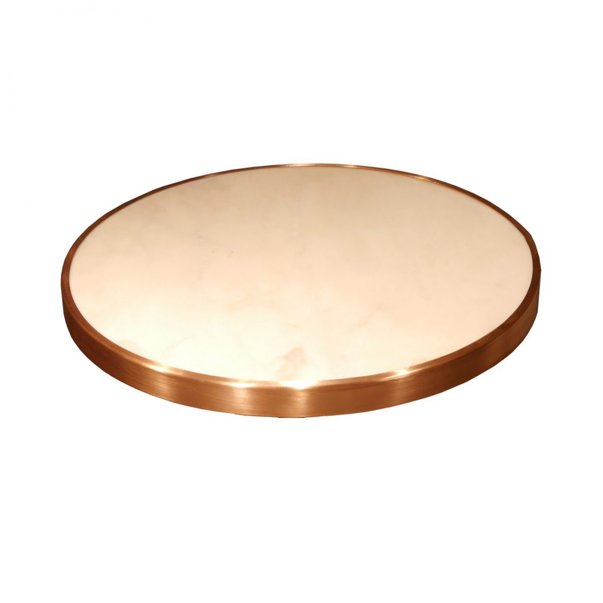 Con el metal cobre natural cepillado se pueden fabricar aros o marcos para sobres de mesa Sobre de Mármol blanco país con aro cobre, espejos y la semiesfera de la mesaMesa MALCONTENTA COBRE.