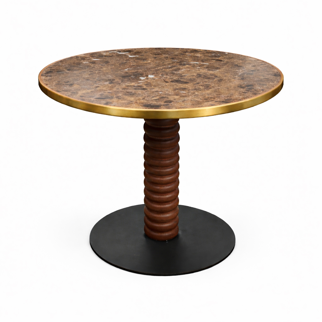 Mesa redonda de diseño con base central de hierro y columna torneada. Estable, personalizable en acabados y sobre, ideal para espacios residenciales y proyectos de hostelería con una estética contemporánea y cuidada.