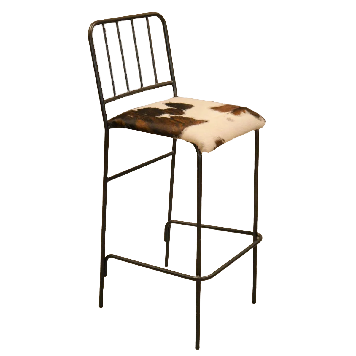 La fotografía del Taburete Abadía muestra una estructura de varilla de hierro con un acabado lacado negro. El respaldo, conformado por varillas, presenta una inclinación ergonómica para mayor comodidad. El asiento, tapizado con piel de vaca.