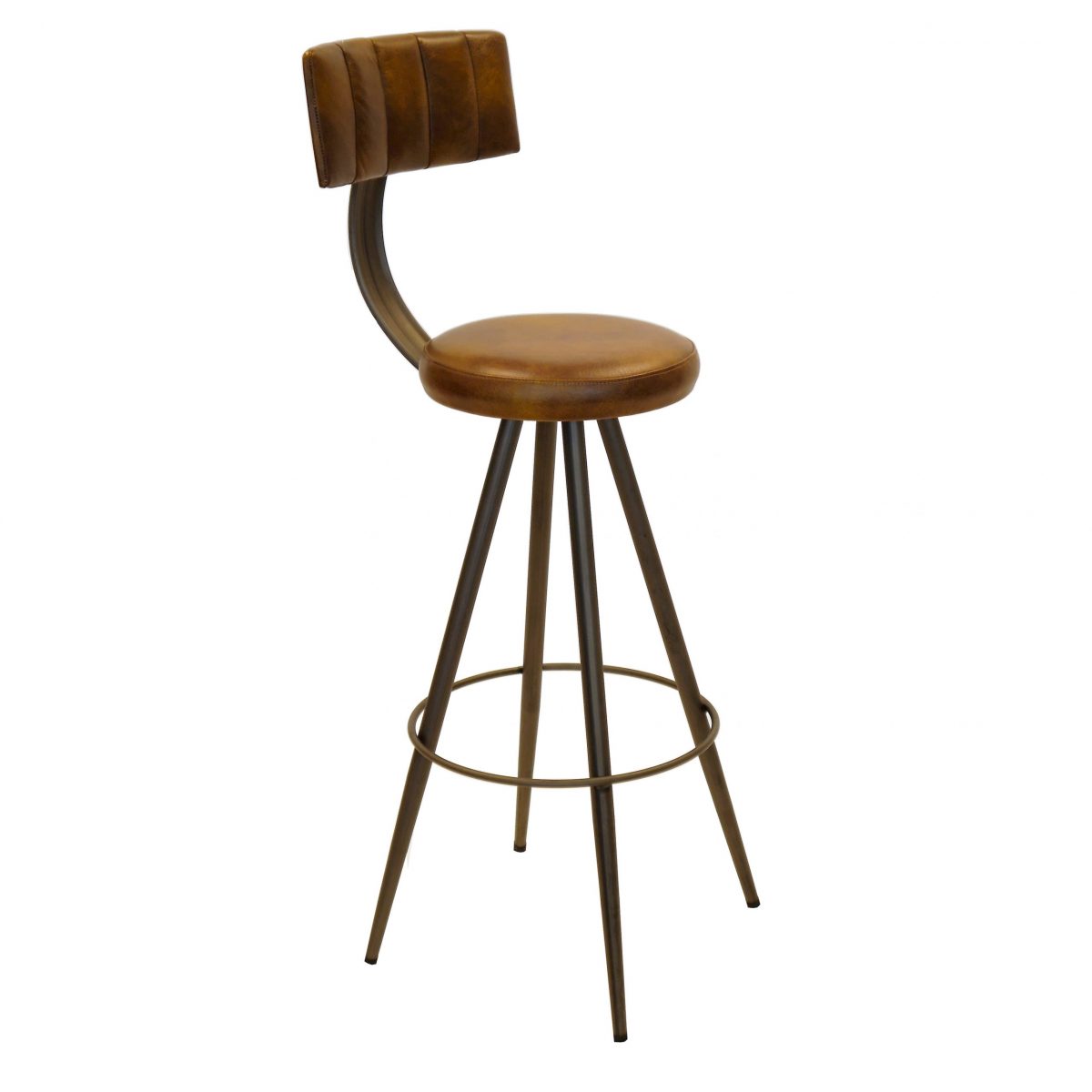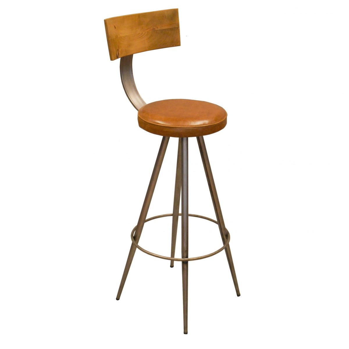 Formado por 4 patas tubulares cónicas de hierro unidos por un aro en la parte inferior en forma de apoya pies, con asiento tapizado en piel a la cera y respaldo en madera de pino viejo. El asiento puede fabricarse en madera de haya, roble o pino macizo. Asientos también disponibles en metal, piel o sintéticos.